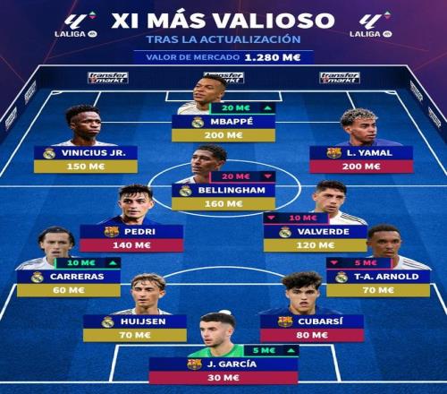 12月12日,德轉(zhuǎn)更新了西甲球員的身價(jià),并且列出最貴首發(fā)陣容。身價(jià)兩億歐的姆巴佩、亞馬爾領(lǐng)銜,皇馬和巴薩包攬11個(gè)位置,陣容總身價(jià)高達(dá)12.8億歐。